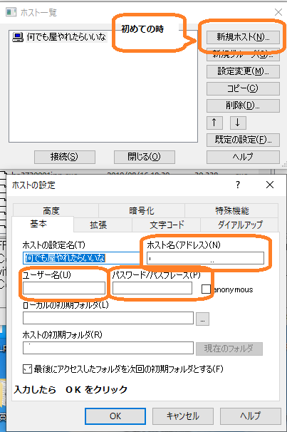 ホストの設定は、ホスト名・ユーザー名・パスワードを入力して OK をクリック。